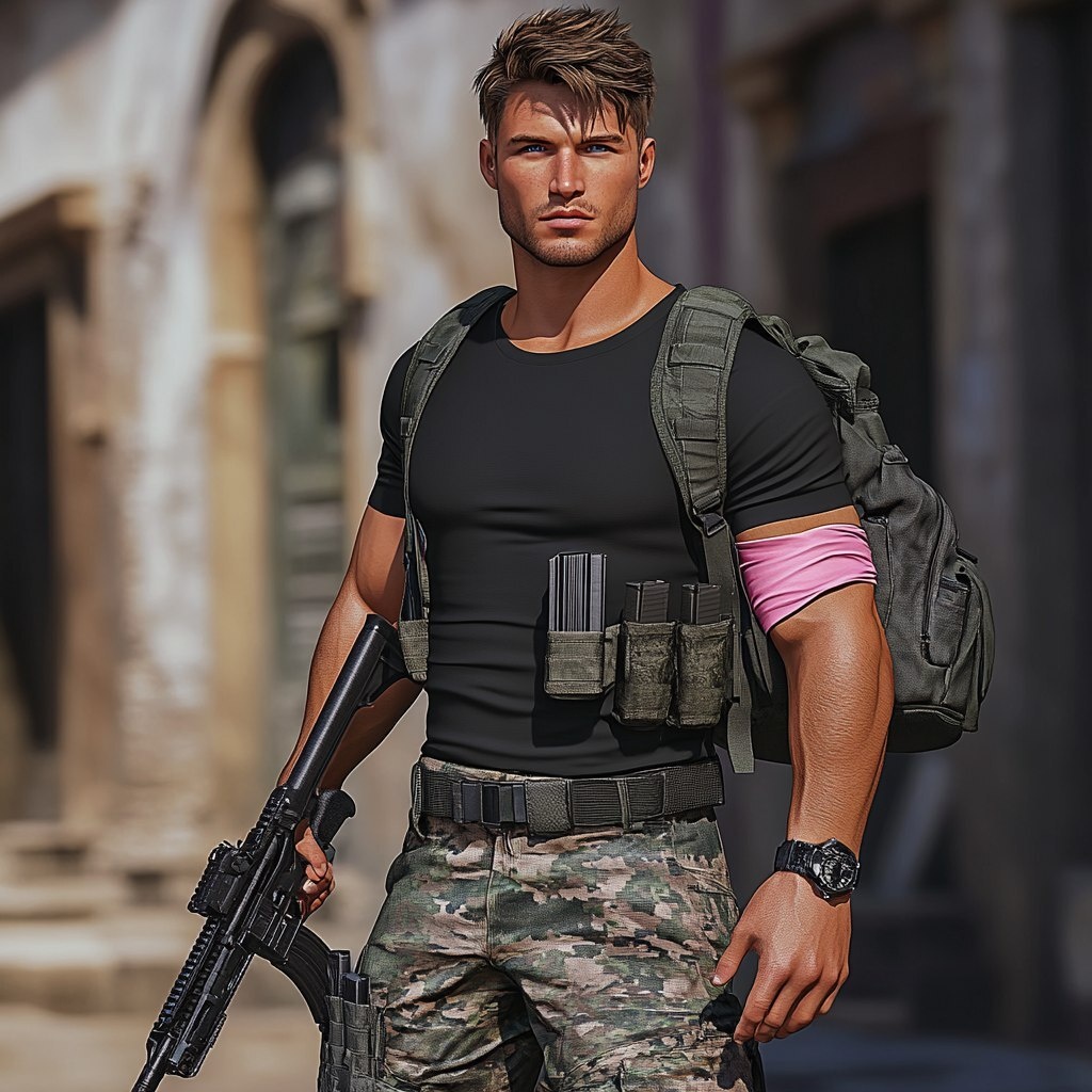 Создано на основе запроса: a athletic built realistic tan male male with brown hair and blue eyes wearing a black t-shirt, long snow camo cargo pants, black backpack, pink bandanna armband and carrying an automatic gun in a ghost town --- Автоперевод: Спортивный построенный реалистичный коричневый мужчина с каштановыми волосами и голубыми глазами в черной футболке, длинные брюки с заснеженными камуматами, черный рюкзак, розовая повязка банданы и автоматическое пистолет в городе-призраке Неплохо вышло? 🤔 https://dzen.ru/id/65c0c65c86e4f837c27b24d7 #ИИ #AI #нейросеть #midjourney #art