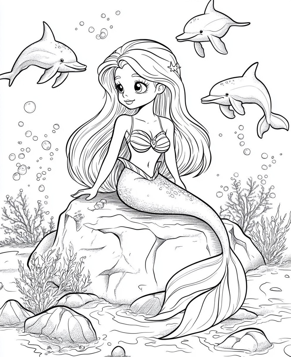 Создано на основе запроса: cute Mermaid sitting on a rock with dolphins jumping in the background, black and white line art, mermaid