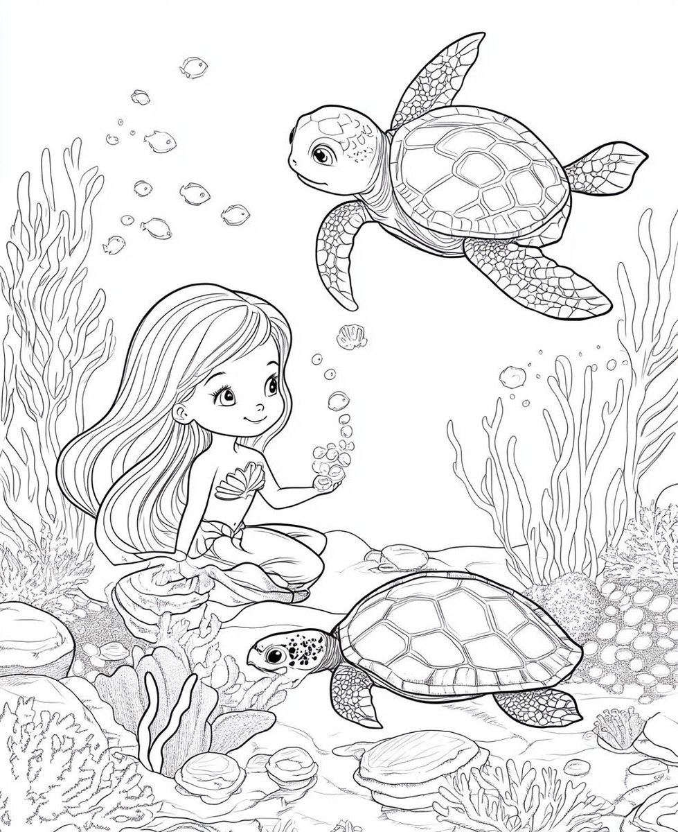 Создано на основе запроса: cute Baby mermaid playing with sea turtles in a coral reef, black and white line art, mermaid, coloring book