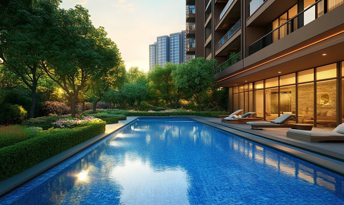 Создано на основе запроса: Modern style swimming pool with beautiful garden next to the pool shining in the morning dress light, luxury