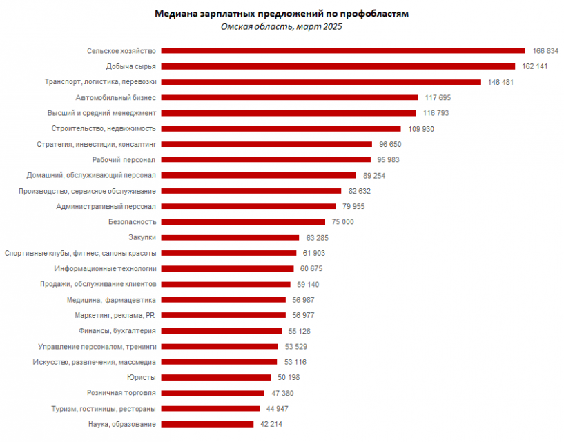 По данным исследования, на конец марта – начало апреля 2025 года аграрии оказались на первом месте среди работников Омской области по уровню предлагаемых заработных плат. В среднем им предлагают 166,8 тысячи рублей. На втором месте — специалисты добывающей сферы с зарплатой в 162,1 тысячи рублей, а на третьем — логисты, чьи доходы составляют 146,5 тысячи рублей. В десятку самых высокооплачиваемых профессий также вошли сотрудники следующих отраслей: «Автомобильный бизнес» (117,7 тысячи рублей), «Высший и средний менеджмент» (116,8 тысячи рублей), «Строительство и недвижимость» (109,9 тысячи рублей), «Стратегия, инвестиции, консалтинг» (96,7 тысячи рублей), «Рабочий персонал» (96 тысяч рублей) и «Производство и сервисное обслуживание» (82,6 тысячи рублей). Тем временем специалисты в ряде других отраслей сталкиваются с зарплатами ниже рыночных. Например, юристы получают в среднем 50,2 тысячи рублей, специалисты сфер «Розничная торговля» — 47,4 тысячи рублей, «Туризм, гостиницы и рестораны