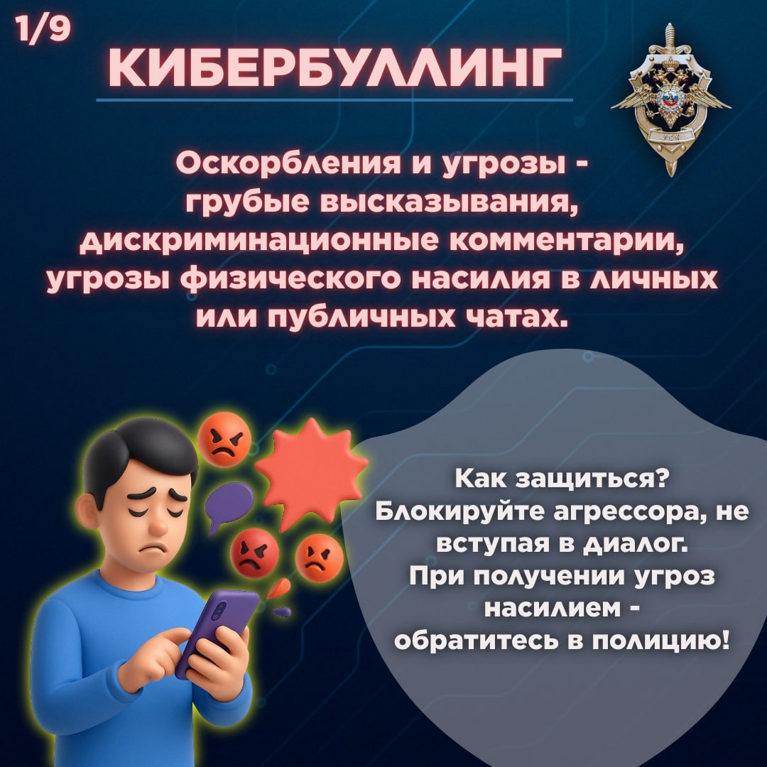 📊Исследования показывают, что кибербуллинг опасен для психического здоровья, особенно для подростков. В России, по данным исследования Высшей школы экономики 2019 года, каждый четвертый школьник сталкивался с этим явлением. ✔️Мы обобщили основные виды кибербуллинга и дали краткие советы, как это можно предотвратить. 🫡Подписаться на Киберполицию России 📲 Вконтакте 📲 Одноклассники 🇷🇺 Чат-бот Киберполиции России