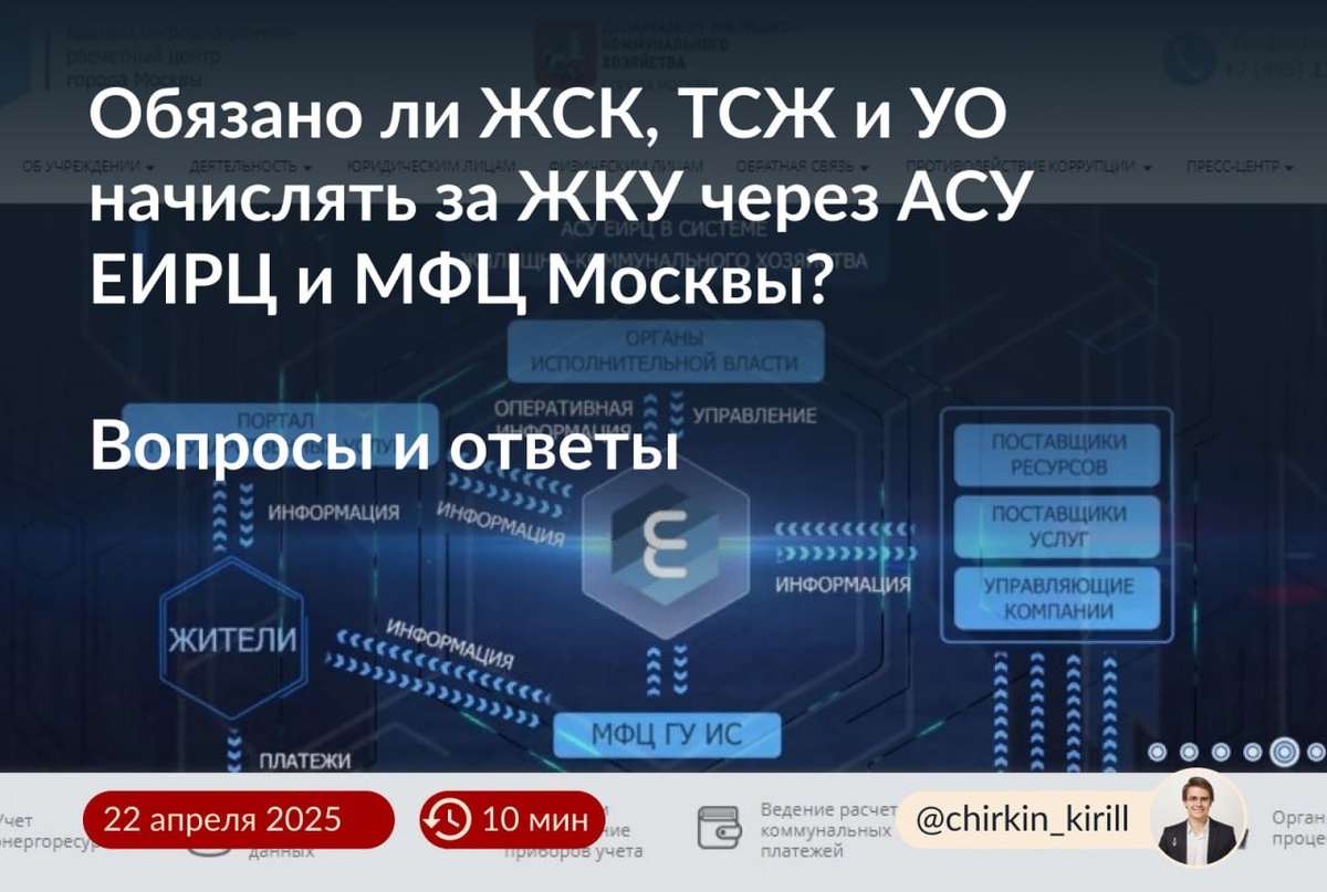 ❓Обязаны ли ТСЖ, ЖСК и УО начислять ЖКУ начислять АСУ ЕИРЦ с 1 января 2026 г.? 5 марта 2025 года опубликовали постановление Правительства Москвы от 05.03.2025 г. №414-ПП. Согласно нему, якобы все УО, РСО, ТСЖ и ЖСК обязаны начислять ЖКУ через АСУ #ЕИРЦ и заключить договор с ГБУ МФЦ. Пару лет нас тоже пытались запихать в АСУ ЕИРЦ. А в 2022 году ЕИРЦ знатно подставило москвичей. Правительство Москвы уже запустило «вертикаль»: сначала появилась рассылка на префектов, позже отдельные управы начали «вылезать» с грозными письмами. Мне поступило множество писем на почту и сообщений в телеграм-канал с вопросом: ❓Должен ли наш ТСЖ (ЖСК или УО) вести расчеты за ЖКУ через АСУ ЕИРЦ с 1 января 2026 года? Мое мнение: Нет, не должны вы вести расчеты через АСУ ЕИРЦ. Не обязаны заключать договор ни с ГБУ РЦ, ни с ГБУ #МФЦ. Потому что: 1️⃣ Это требование есть прямое нарушение ст. 445 ГК РФ, в которой прямо указано, что заключение договора в обязательном порядке может быть только в соответствии с