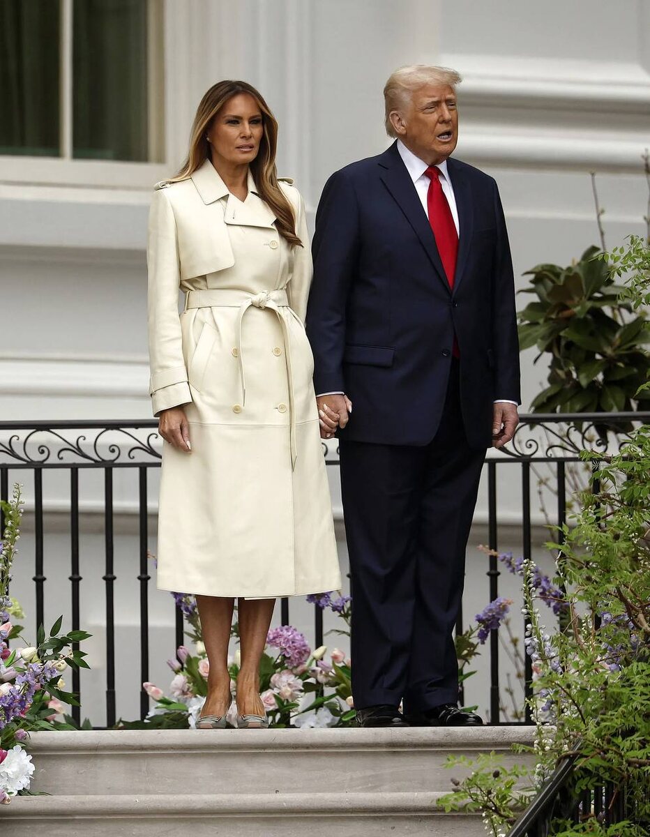 Мелания Трамп по долгу службы присоединилась к празднованию Пасхи в Белом доме. По традиции в понедельник, на лужайке Белого дома проходит ежегодное катание пасхальных яиц. Дети приходят со своими пасхальными корзинками, и катают раскрашенные яйца (искусственные) по лужайке около президентского дворца. Раньше к ним мог присоединиться и президент США. В этом году Дональд и Мелания дали старт соревнованию. Мелания была в кожаном тренче молочного оттенка канадского бренда Mackage и несвойственным ей туфлям на маленьком каблуке Roger Vivier. У брендов нет производств в Китае, на которые, напомним, Дональд Трамп наложил пошлины размером в 145%. О прошлых выходах и выходках Мелании мы писали здесь.