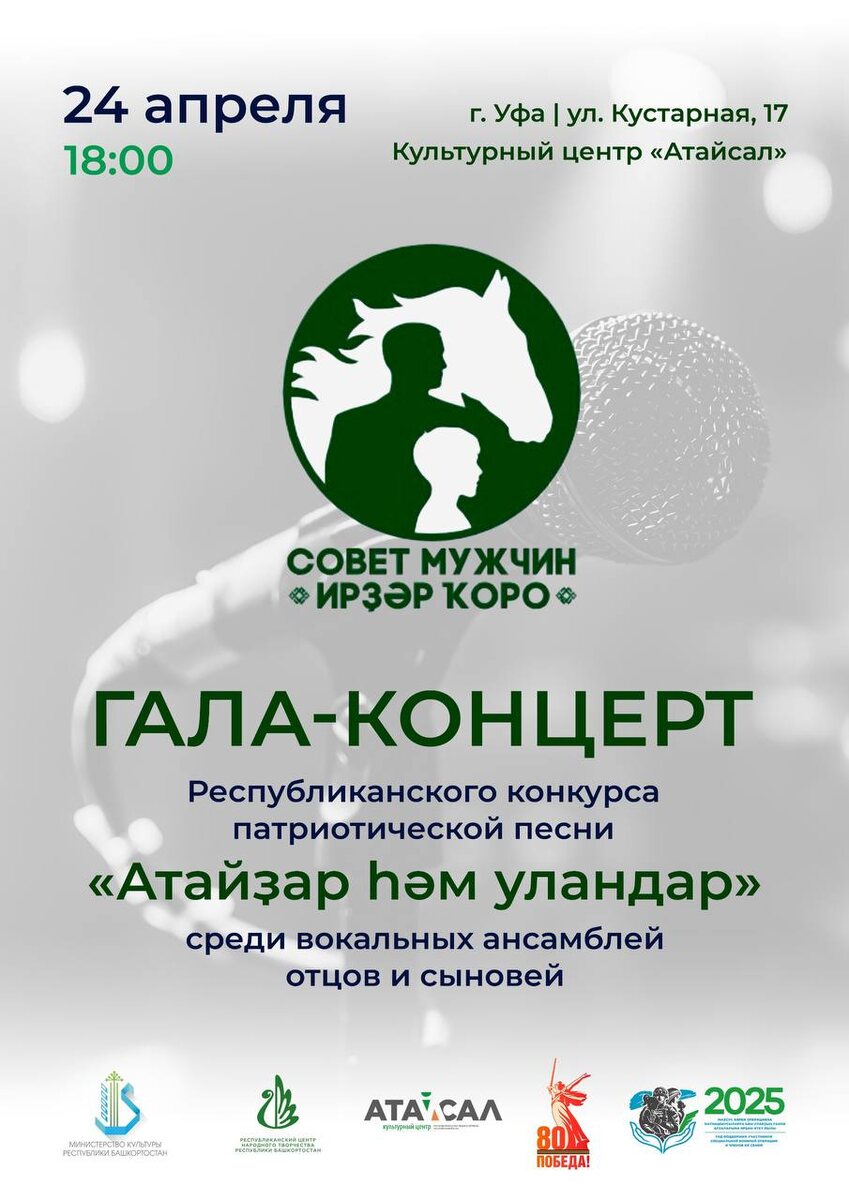 ХӨРМӘТЛЕ ЯҠТАШТАР! УВАЖАЕМЫЕ ЗЕМЛЯКИ! Важно передавать подрастающему поколению духовные ценности, которые хранятся в песнях о любви к родной земле и храбрых защитниках Отечества. Региональная общественная организация «Совет мужчин» Башкортостана при поддержке Министерства культуры РБ проводит Республиканский конкурс патриотической песни «Атайҙар һәм уландар» («Отцы и сыновья») среди вокальных ансамблей отцов и сыновей. Конкурс посвящён 80-летию Победы в Великой Отечественной войне и Году поддержки участников СВО и членов их семей. До 10 апреля 2025 года принимались заявки. Компетентное Жюри из более 100 песен выбрал в финал конкурса 16 лучших. Просмотрев эти выступления могу сказать, что перед жюри стоит трудная задача — определить Гран-при и другие призовые места, поскольку все участники талантливы, исполняют свои песни на высоком уровне. И во всех номерах чувствуется безмерное уважение отцов и сыновей друг другу. 🎶 Гала-концерт и Финал конкурса состоится 24 апреля 2025