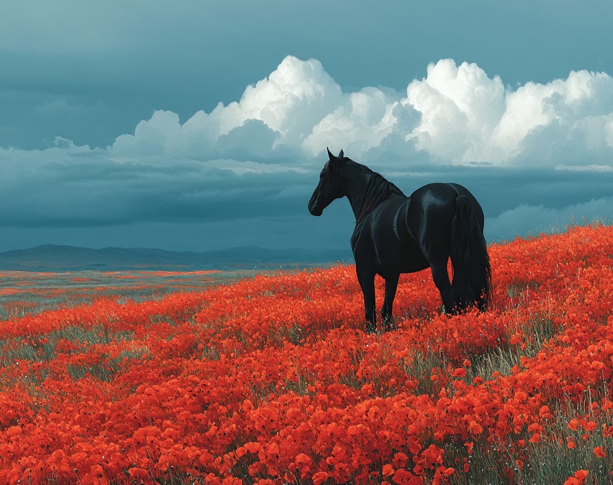 Создано на основе запроса: black arabian horse stands on a green hill dominating a blooming poppy meadow, blue sky white clouds pierced by