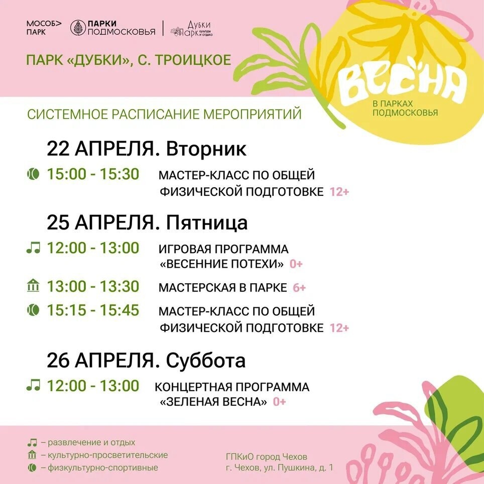 ✨ Мероприятия в парке Дубки на этой неделе Ждём Вас в парке 💚 🏢 Парк культуры и отдыха «Дубки» 📍 г.о.Чехов, с.Троицкое, парк "Дубки" 🪙 Вход свободный❗️ #webЧехов ✅ Мероприятия Чехов https://dzen.ru/id/66cc4b48e9ef144699238a51 http://vk.com/chekhov_events http://dzen.ru/chekhov_events