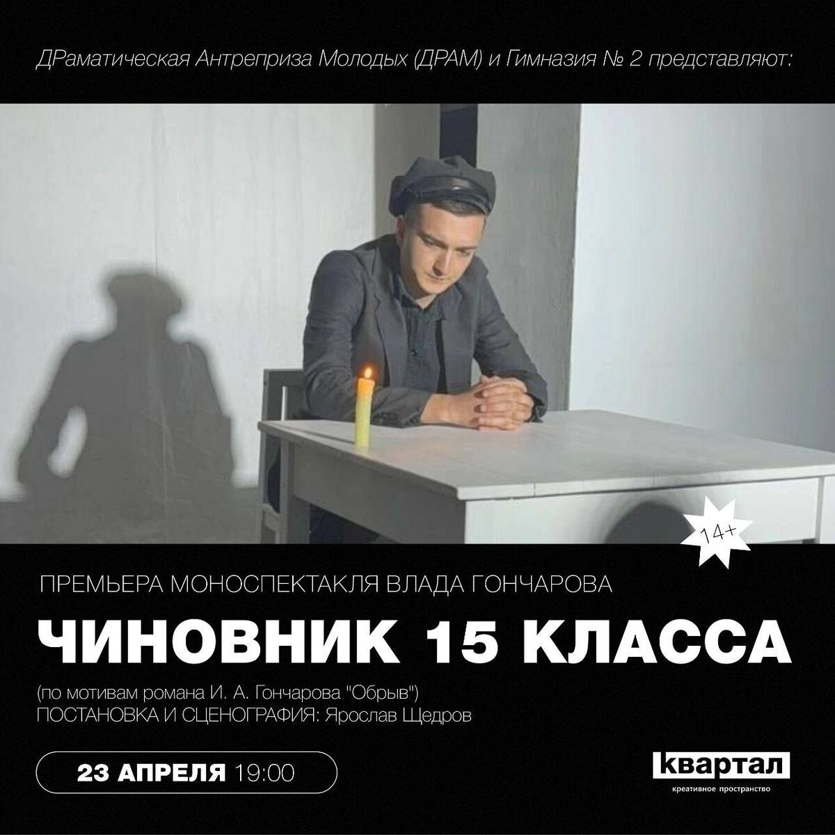 ДРаматическая Антреприза Молодых (ДРАМ) и Гимназия № 2 представляют: ПРЕМЬЕРА МОНОСПЕКТАКЛЯ ВЛАДА ГОНЧАРОВА "ЧИНОВНИК 15 КЛАССА" (по мотивам романа И. А. Гончарова "Обрыв") | 14+ 🗓️ 23 апреля, 19.00 📍Квартал, Ленина 78 ПОКАЯНИЕ У КРАЯ В романе Гончарова про Татьяну Марковну Бережкову, её внучек и племянника человеку нового времени Марку Волохову уделяется ровно столько внимания, чтобы раскрыть черты неблагонамеренного выразителя революционных крайностей. В новом спектакле на первый план выходят чувства Волохова его мятущаяся душа, полная лирических переживаний. Его нравственное биполярное расстройство, которое и приводит молодого, умного и честного человека к краю Обрыва… 🏷️ свободные взносы #23апреля25