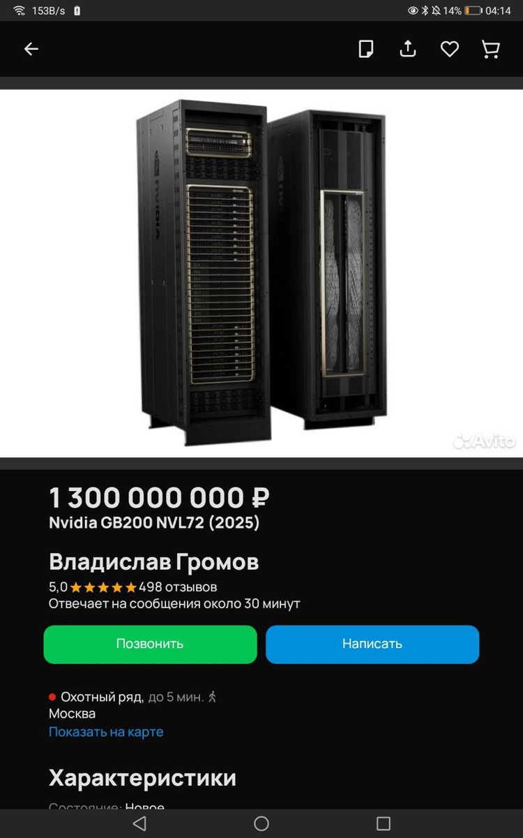 Что нашел на Авито - надо брать... GB200 NVL72 — это серверный шкаф, состоящий из 36 центральных процессоров Nvidia Grace и 72 графических процессоров B200 на новейшей архитектуре Blackwell.