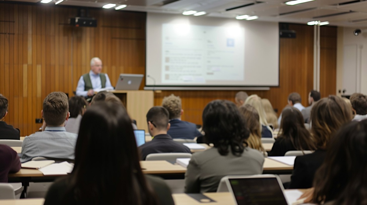 Создано на основе запроса: close focus photo from the back of a university lecture theatre, sharp focus on the backs of students seated in front, showing heads, shoulders, notebooks, and laptops, blurred background with professor lecturing near a whiteboard or projector screen, shallow depth of field, academic setting, soft indoor lighting, realistic photographic style --- Автоперевод: Клизом фокусировку фото из лекционного театра университетского лекции с резким фокусом на спинах студентов, сидящих впереди, показывают головы, плечи, ноутбуки и ноутбуки, размытый фон с профессором, лекциями возле доски или экрана проектора, неглубокой глубины поля, академической обстановкой, мягким освещением в помещении, реалистичным фотографическим стилем или проектором. Красиво вышло? 🤔 https://dzen.ru/id/65c0c65c86e4f837c27b24d7 #ИИ #AI #нейросеть #midjourney #art
