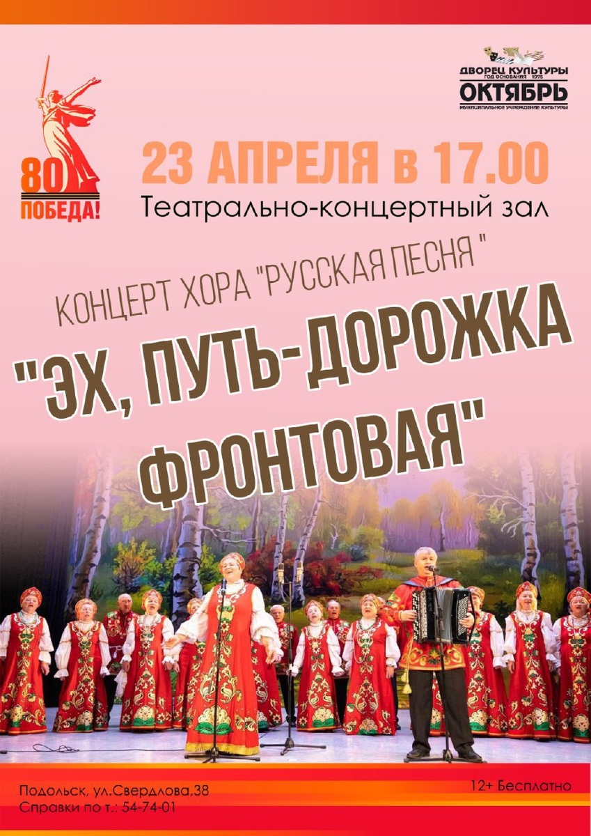 ✨ Концерт «Эх, путь - дорожка фронтовая… Участники хора «Русская песня», руководитель и концертмейстер Владимир Недорослев, приглашают на программу, посвященую 80-летию Победы в Великой Отечественной войне. Прозвучат песни «Журавли» Я.Френкеля, «Казаки в Берлине» Дм. и Д.Покрасс и Ц. Солодарь, «Когда мы были на войне» В. Столярова и Д.Самойлова… а также русские народные, казачьи песни, романсы, песни советских композиторов. 🚫 Возраст: 12+ 📆 23.04.2025 🕒 17:00 🏢 Дворец культуры «Октябрь» 📍 г. Подольск, ул. Свердлова, д.38 💰 Вход свободный❗️ #webПодольск ✅ Мероприятия Подольск https://dzen.ru/id/66ed500f7b5671493eca3fd6 http://vk.com/podolsk_events http://dzen.ru/podolsk_events