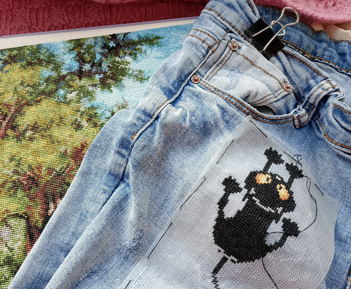 Второй мой процесс - это вышивка на водорастворимой канве. Себе на летних джинсах захотела вышить чёрного котейку. Схему нашла давно, где-то в интернете. У меня скорее всего фото схемы, оно какое-то размытое и плохо читается, поэтому шью больше по своему чутью, чем по схеме.