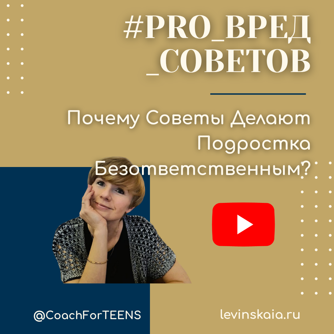 ❌ ПОЧЕМУ СОВЕТЫ ДЕЛАЮТ ПОДРОСТКА БЕЗОТВЕТСТВЕННЫМ | Светлана Левинская Как наши благие намерения: предупредить, подсказать, дать совет Подростку ведут к провалу, даже если результат получен хороший? В этом видео поговорим о том, как: → мозг обрабатывает "ошибку" и "победу" → мы воруем ответственность у Подростка, давая советы → эффективно обучать Подростка самостоятельности и ответственности 🎞 Смотрите, где удобно: ВКонтакте ➡ YouTube ➡ RuTube ➡ 💬 "А вы часто даете советы своему подростку?" — напишите в комментариях! ✍️Подписывайтесь, чтобы оставаться в теме @coachforteens