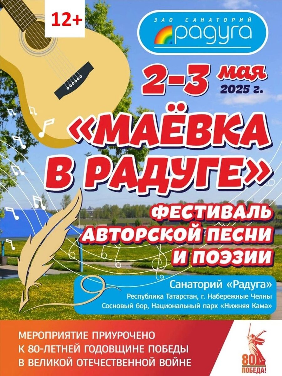 Дорогие друзья и творческие души! С радостью сообщаем, что открыт прием заявок на участие в фестивале авторской песни и поэзии "Маёвка в Радуге", который пройдет 2-3 мая 2025 года. Если вы автор песен, поэт или просто любите делиться своим творчеством, мы ждем именно вас! Как подать заявку: Заполните анкету участника, которую можно найти по ссылке: vk.com/doc-219344869_684346.... Прикрепите аудиозапись или видео вашего выступления (если есть). Отправьте заявку на электронную почту: maevkavraduge@mail.ru Либо по номеру телефона: 8-927-08-07-457 Сроки подачи заявок: Прием заявок открыт до 25 апреля 2025 года. Что мы предлагаем участникам: Уникальная возможность выступить на сцене фестиваля Подарки и призы для лучших исполнителей Не упустите шанс стать частью этого замечательного события! Мы ждем ваши заявки и с нетерпением готовимся к встрече с вами на "Маёвке в Радуге"! С любовью, Организаторы фестиваля "Маёвка в Радуге"