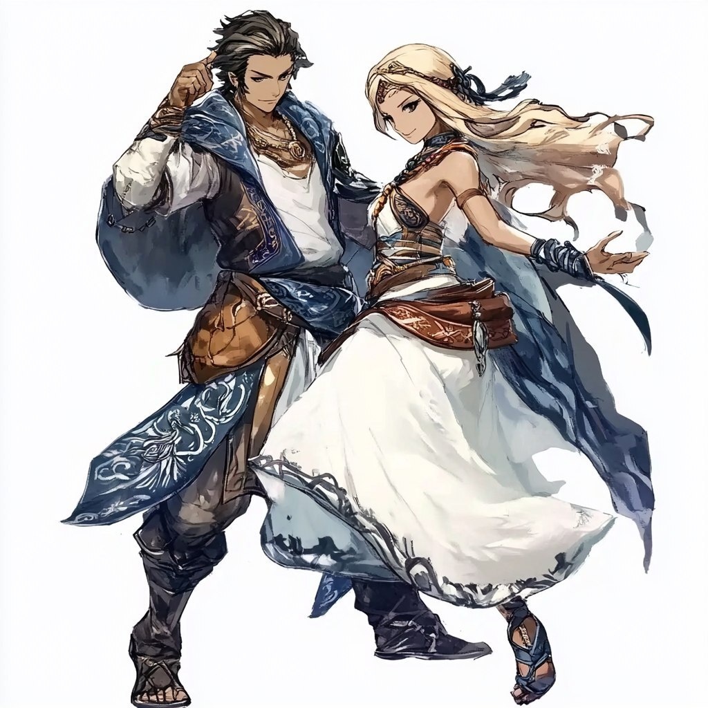 Создано на основе запроса: Fantasy concept illustration, Humans, Male Norse dancing with Female Arab, Male Norse style, Female Arabian