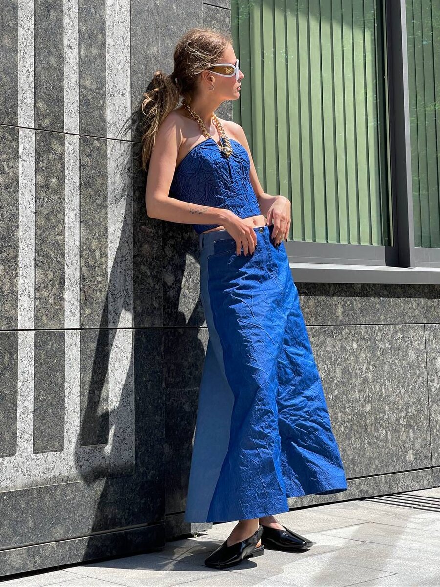 Среди наших клиентов дроп из жатого денима с металлом в составе произвел эффект разорвавшейся бомбы. Конечно, ни один российский дизайнер не пошел бы на такой риск. Мы пошли и не прогадали - самые эксклюзивные модели очень быстро sold’аутнулись. На фото корсет из денима с металлическими волокнами и юбка из него же, с заниженной талией. Осталось несколько комплектов. Welcome 🤍