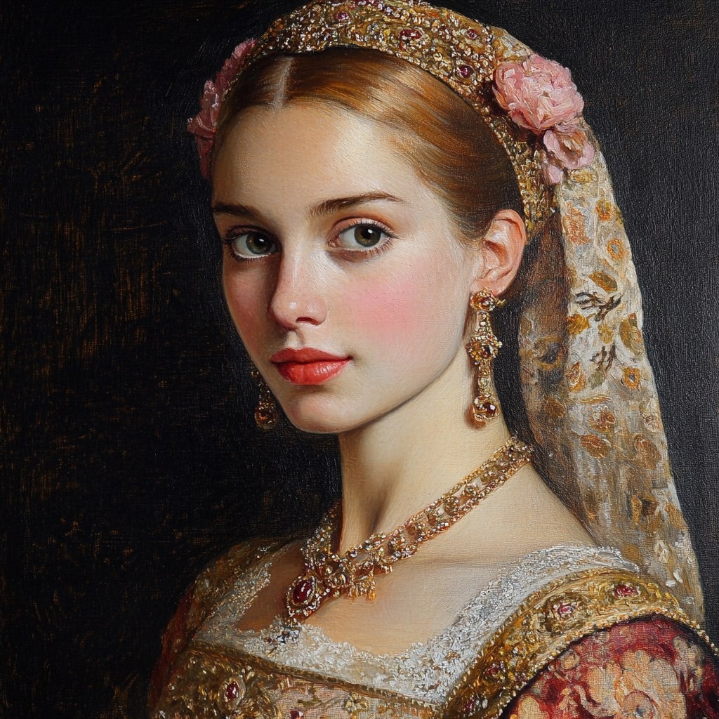 Создано на основе запроса: Daughter of King Ferdinand V of Spain, a princess in her 30s, a portrait full of elegance,oil painting --- Автоперевод: Дочь короля Фердинанда V из Испании, принцессы в возрасте 30 лет, портрет, полный элегантности, масляной живописи Классно выглядит? 🤔 https://dzen.ru/id/65c0c65c86e4f837c27b24d7 #ИИ #AI #нейросеть #midjourney #art