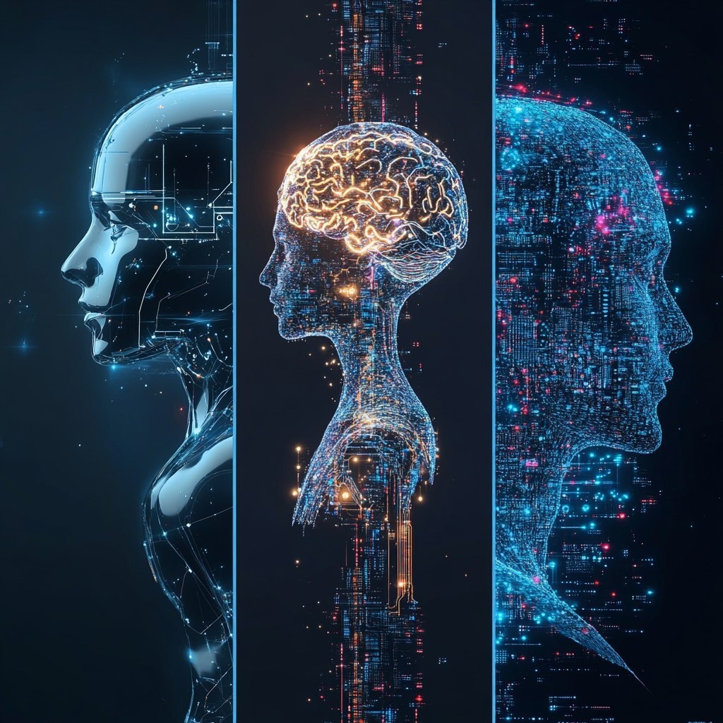 Создано на основе запроса: 3 separate images of the progression from Artificial Narrow Intelligence to Artificial General Intelligence and