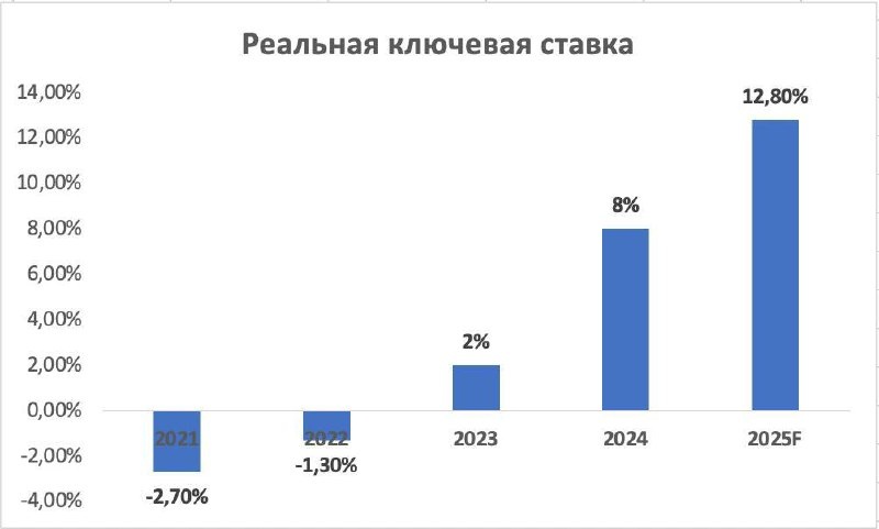 Реальная ключевая ставка: что это такое и как использовать? Сама по себе ключевая ставка в отрыве от инфляции не имеет никакого смысла, важна ее связь с инфляцией. Ну стала ставка 20% или 30% - номинальная цифра ни о чем не говорит. Важна какая инфляция реальная. Реальная ставка, это разница между ключевой ставкой и инфляцией за последние 12 месяцев. Прикрепил внизу график ее динамики за 5 лет. Мы берем инфляцию от росстата, да она имеет ряд недостатков, но все равно остается лучшим способом измерения инфляции. Сопоставимая корзина, длинный ряд, ну и она достаточно точно отражает структуру потребления типичного россиянина. Если у вас высокая доля импорта - сумки биркин и французский сыр, то ваша инфляция может отличаться, это совершенно нормально и ничему не противоречит. Даже, если считать что Росстат рисует инфляцию - то рисует ее всегда, и реальная отображает настоящий уровень жестокости регулятора. Правильнее смотреть на ключевая ставка - минус инфляционные ожидания, но я не
