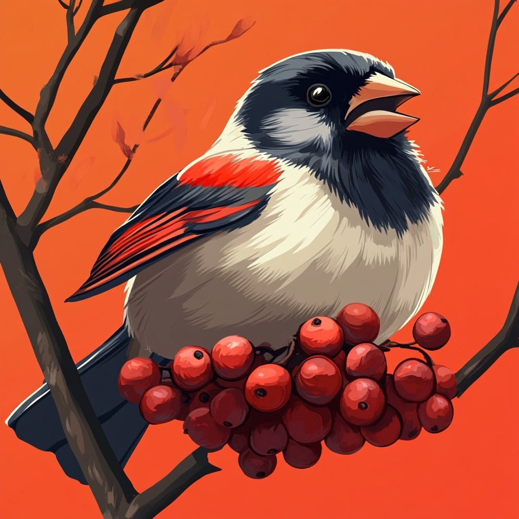 Создано на основе запроса: angry very fat bullfinch in cartoon style flying choked on a big rowan berry