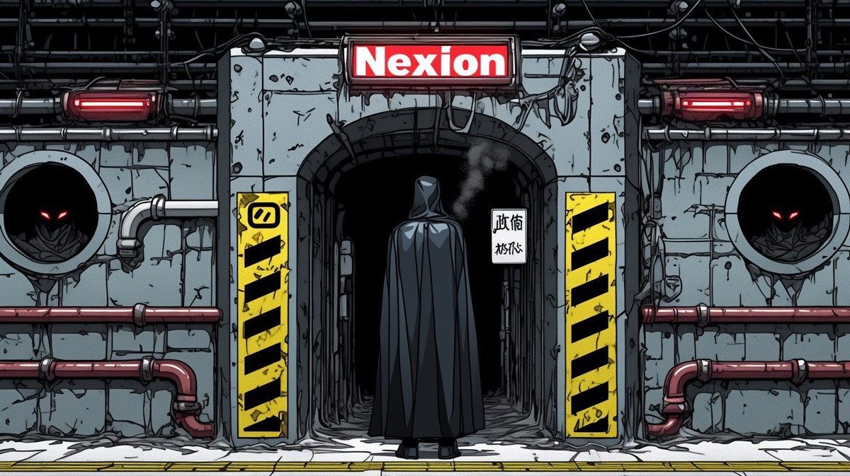 Создано на основе запроса: ancient underground tunnel system beneath "Nexion", filled with red emergency lights and mystical glowing runes