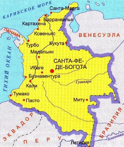 Колумбия — одна из самых разнообразных и интересных стран Южной Америки, расположенная на северо-западе континента. Она граничит с пятью странами: Венесуэлой на востоке, Бразилией и Перу на юге, Эквадором на юго-западе и Панамой на северо-западе. Кроме того, страна имеет выходы к двум океанам: на севере — к Карибскому морю, а на западе — к Тихому океану, что обеспечивает Колумбии важное стратегическое и торговое положение.