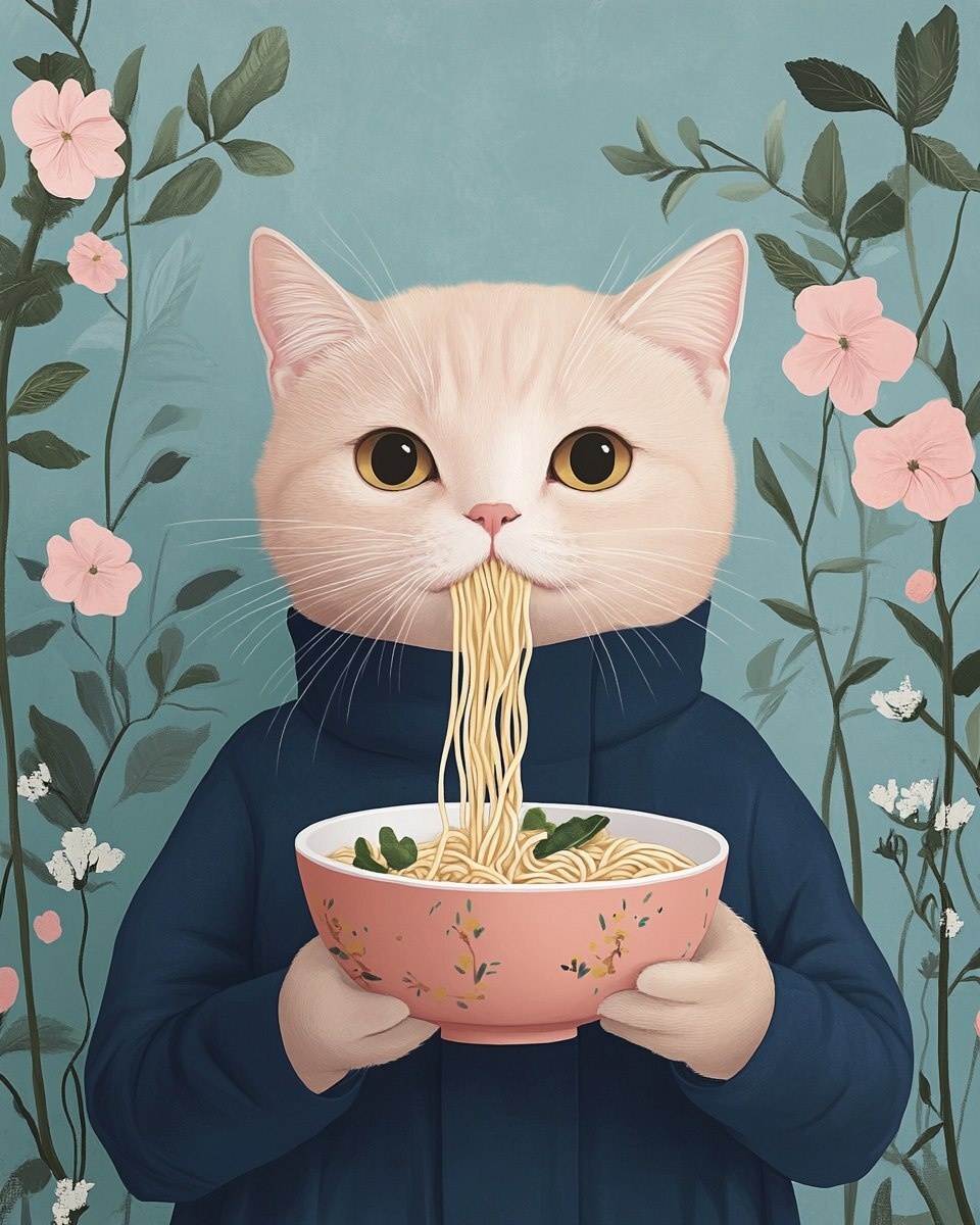 Создано на основе запроса: surreal pop art illustration of a cat with a bowl of ramen