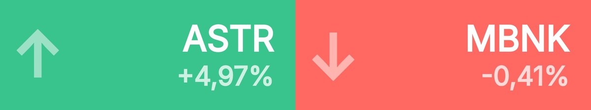 🔺 Топ-10 лидеров роста среди крупнейших акций: Астра • 421 ₽ • 4,97% ПИК • 464 ₽ • 3,11% ГК Самолет • 1 215 ₽ • 2,75% ТГК № 1 • 0,01 ₽ • 2,48% Группа Поз • 1 321 ₽ • 2,45% ММК • 34,12 ₽ • 2,25% Мечел • 96,82 ₽ • 2,24% VK • 261 ₽ • 2,19% Юнипро • 1,85 ₽ • 2,15% Мечел прив • 98,10 ₽ • 2,08% 🔻 Топ-10 лидеров падения среди крупнейших акций: МТС Банк • 1 344 ₽ • -0,41% Мать и дит • 999 ₽ • -0,29% Инарктика • 662 ₽ • -0,08% Татнефть • 706 ₽ • -0,07%