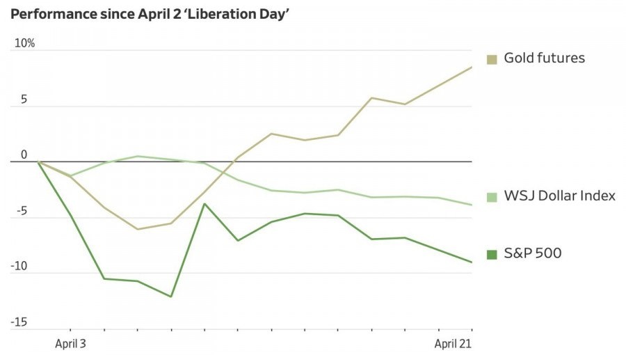 https://basechop.ru/wordpress/?p=39472 Невозможно влить капитал в экономику, которая нестабильна из-за политики. Деньги продолжают течь за пределы Соединенных Штатов, и нападки Дональда Трампа на ФРС придают ускорение этому процессу. К тому же Китай не собирается поднимать руки вверх из-за торговой войны и прекращает импорт американского СПГ. Инвесторы сомневаются, что переговоры Вашингтона с другими странами дадут быстрый эффект и продолжают продавать S&P 500. Динамика золота, доллара США и S&P 500 Со Дня освобождения Америки, как назвал хозяин Белого дома день введения взаимных тарифов, прошло немало времени. Уже можно сделать выводы. Главными бенефициарами самых масштабных пошлин на импорт США с начала XX века стали активы-убежища во главе с золотом. Проигравшими – американские активы. Причем рост доходности казначейских облигаций и падение доллара убеждают, что они уже не являются спасительными гаванями. Апрель может стать худшим вторым месяцем весны для индекса Доу-Джонса с 193