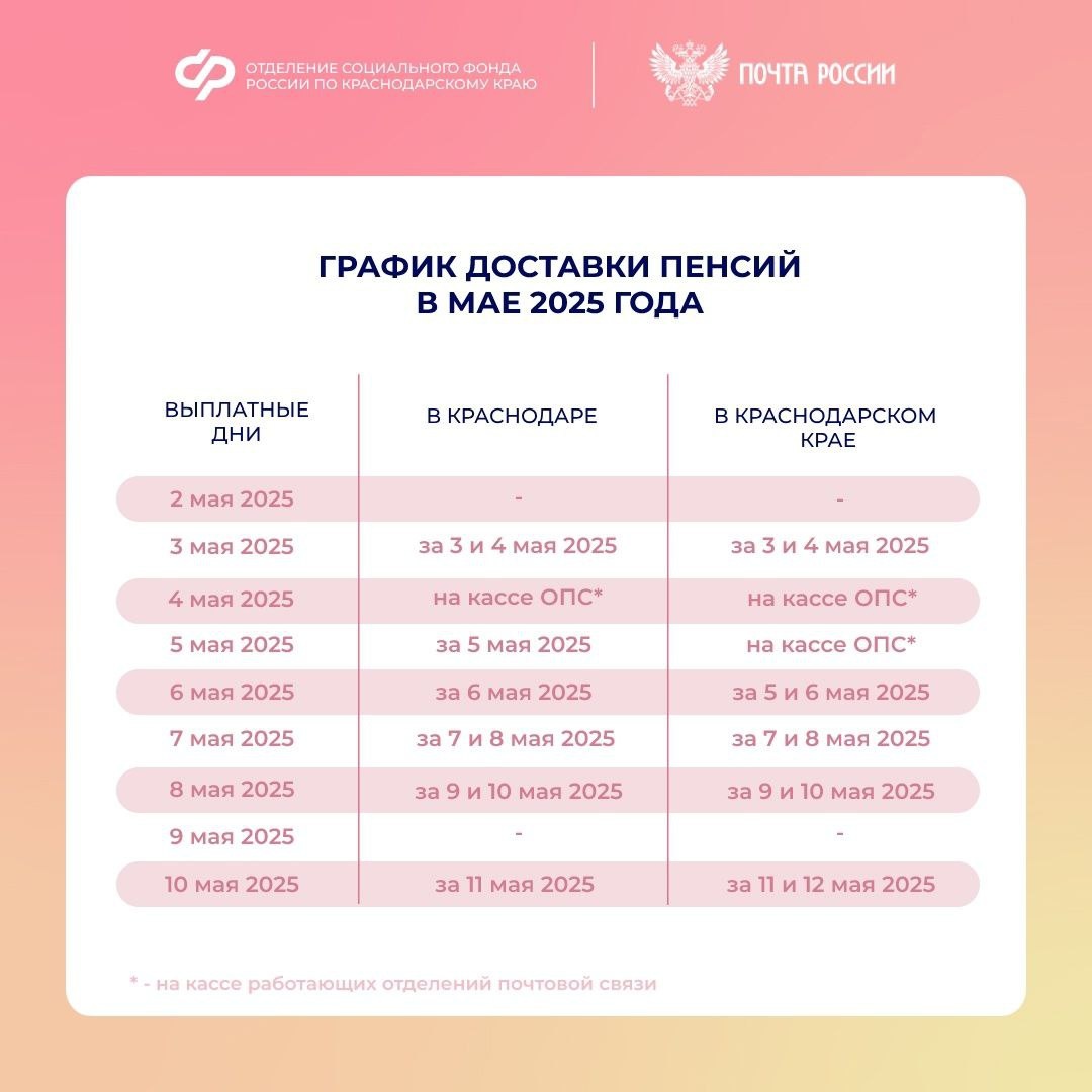 📆 Доставка пенсий в Краснодарском крае в мае 2025 года: график выплат на почте 📌 В связи с предстоящими майскими праздниками изменен график доставки пенсий и социальных выплат через отделения почтовой связи Краснодарского края. Подробнее — в нашей инфографике ⤴ ☎️ 🏠 Если остались вопросы, то всегда можно обратиться в единый контакт-центр СФР 8(800)100-00-01 или лично в клиентскую службу Отделения СФР по Краснодарскому краю. 🚀 👉 Подписывайтесь на наш канал в Телеграм и будьте в курсе всех мер соцподдержки 🔥 #СФР #пенсиисфр #график #почта #важнознать