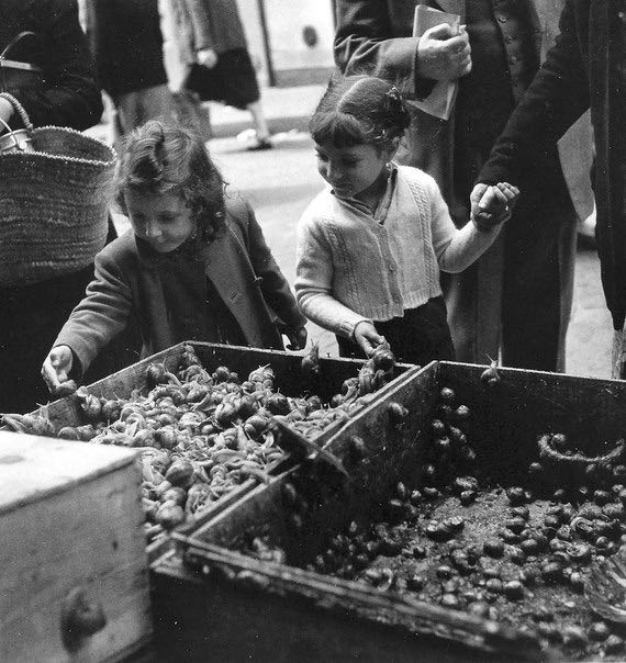 Классический снимок Робера Дуано запечатлел сценку на парижском рынке в 1951 году. Продавщица предлагает покупательнице живых виноградных улиток – традиционный французский деликатес (эскарго). Послевоенный Париж постепенно возвращался к мирной жизни, и уличные рынки, подобные этому, были ее неотъемлемой частью, предлагая горожанам как повседневные продукты, так и гастрономические изыски.