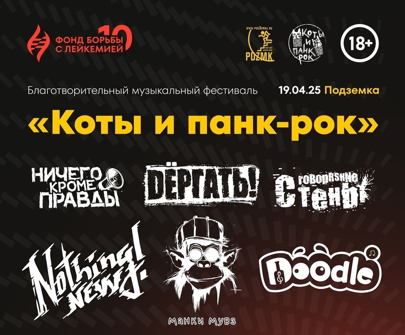 Фестиваль «Коты и панк-рок» прошел 19 апреля в Ростове-на-Дону и стал ярким примером того, как музыка и добрые сердца могут объединиться ради важной цели. Несмотря на насыщенный концертный день — в тот же вечер в городе играли группы «Stigmata» и «Ангел-Хранитель» — у фестиваля нашлась своя преданная аудитория. Люди пришли не только за драйвом и живой музыкой, но и чтобы поддержать благотворительную миссию. За 6 часов непрерывного панка и невероятной энергетики удалось собрать 108 тысяч рублей, которые в полном объёме были переведены в Фонд борьбы с лейкемией. Это больше, чем на первом фестивале в прошлом году. По словам организатора Игоря Щупакевича, успех события превзошёл все ожидания. «С первой же песни первой выступающей группы и до завершения концертной программы народ плясал и «слэмился». Шесть часов пролетели, как один миг <…> Это всё показало мне, что всё-таки не зря я это всё затеял». Фестиваль стал не просто концертом — он стал праздником взаимной поддержки, тепла и панк-ро