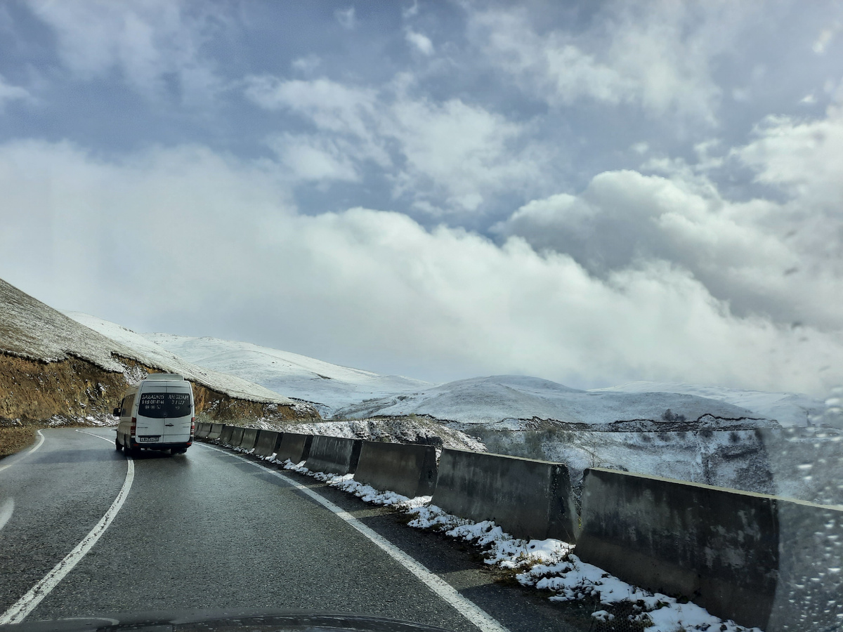 Высокогорное озеро Казеной-АМ стало для нас одной из остановок в нашем путешествии и находится оно в живописном месте Северного Кавказа. Добирались мы сюда на своей машине со стороны Грозного по трассе 96К-003. Перед самим подъемом к этому озеру по дороге было 2 КПП, на которых водителю нужно было подойти к одному из сотрудников и показать документы (права, СТС) а так же сказать сколько человек в машине едет и всё, никому другому выходить не надо и машину с вещами не досматривают. Дорога, ведущая к озеру, пленила нас своей красотой извиваясь среди гор покрытыми снежными шапками. Пейзажи вокруг вызывали у нас восторг, радость и восхищение. Сотни светлых точек на склоне (фото выше) это стадо баранов. Так много мы еще не видели сразу вместе :) Однако, когда мы наконец достигли Казеной-Ам, погода решила внести свои коррективы. Облака затянули озеро, скрыв его красоту от нас, а так же ещё пошел небольшой снег. Но несмотря на всё это, мы осознали, что даже в такой обстановке Казеной-Ам с