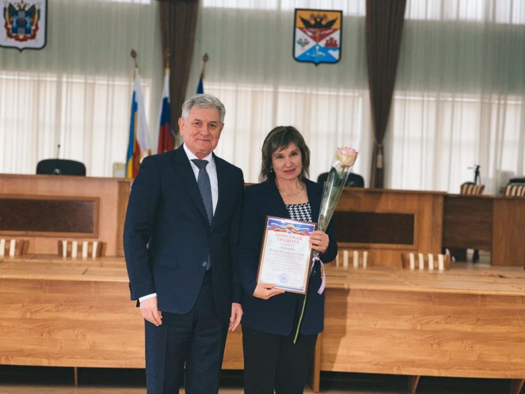 21 апреля в День местного самоуправления в администрации Новочеркасска состоялось чествование лучших сотрудников муниципалитета и городской Думы за добросовестный труд, ответственное отношение к делу и верность профессии. Почетными гостями торжественного собрания стали депутаты Законодательного Собрания Ростовской области, исполняющий обязанности главы администрации Виктор Синюгин, зампредседателя городской Думы Андрей Карабедов, проректор ЮРГПУ (НПИ) им.М.И.Платова Евгений Журченко. «Есть люди, которые непосредственно работают «на земле», с людьми, взаимодействуя с ними каждый день. Им приходится решать нестандартные, непростые, а порой невыполнимые задачи. И благодаря этому труду, мы видим, как улучшается наш город, и над чем еще необходимо поработать», — отметил Андрей Карабедов. Председатель городского совета ветеранов Виктор Буров от общественной организации вручил виновникам торжества медали «80 лет Победы в Великой Отечественной войне». Фото: телеграм-канал Юрия Лысенко