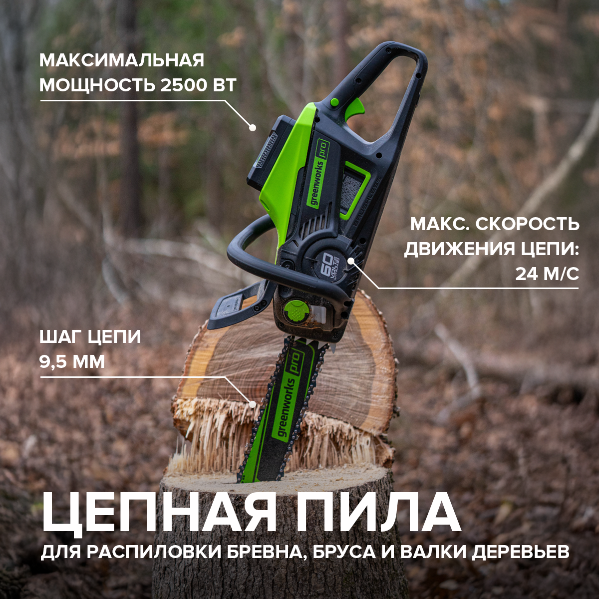 Первоклассная техника для любых задач — мощная и производительная аккумуляторная цепная пила Greenworks GD60CS25 (2008907) на платформе 60V легко справится как с распиловкой брёвен и бруса, так и с валкой деревьев. Благодаря энергоэффективному бесщёточному двигателю с внешним ротором аккумуляторная пила не уступает бензиновым аналогам. Мощность устройства — 2500 Вт, а скорость движения цепи 24 м/с. При этом двигатель DigiPro долговечен, работает тихо и не требует обслуживания. Высокая скорость цепи с повышенной режущей способностью обеспечивает отличную производительность. Длина пильной шины из кованой стали — 40 см. Смазка автоматически поступает на цепь из бака ёмкостью в 200 мл. Срок гарантии — 3 года. Пила работает от универсальных аккумуляторов 60V, совместимых с 30+ моделями техники Greenworks платформы 60V. РРЦ: 20990 руб. Приобрести поставляется без АКБ и ЗУ.