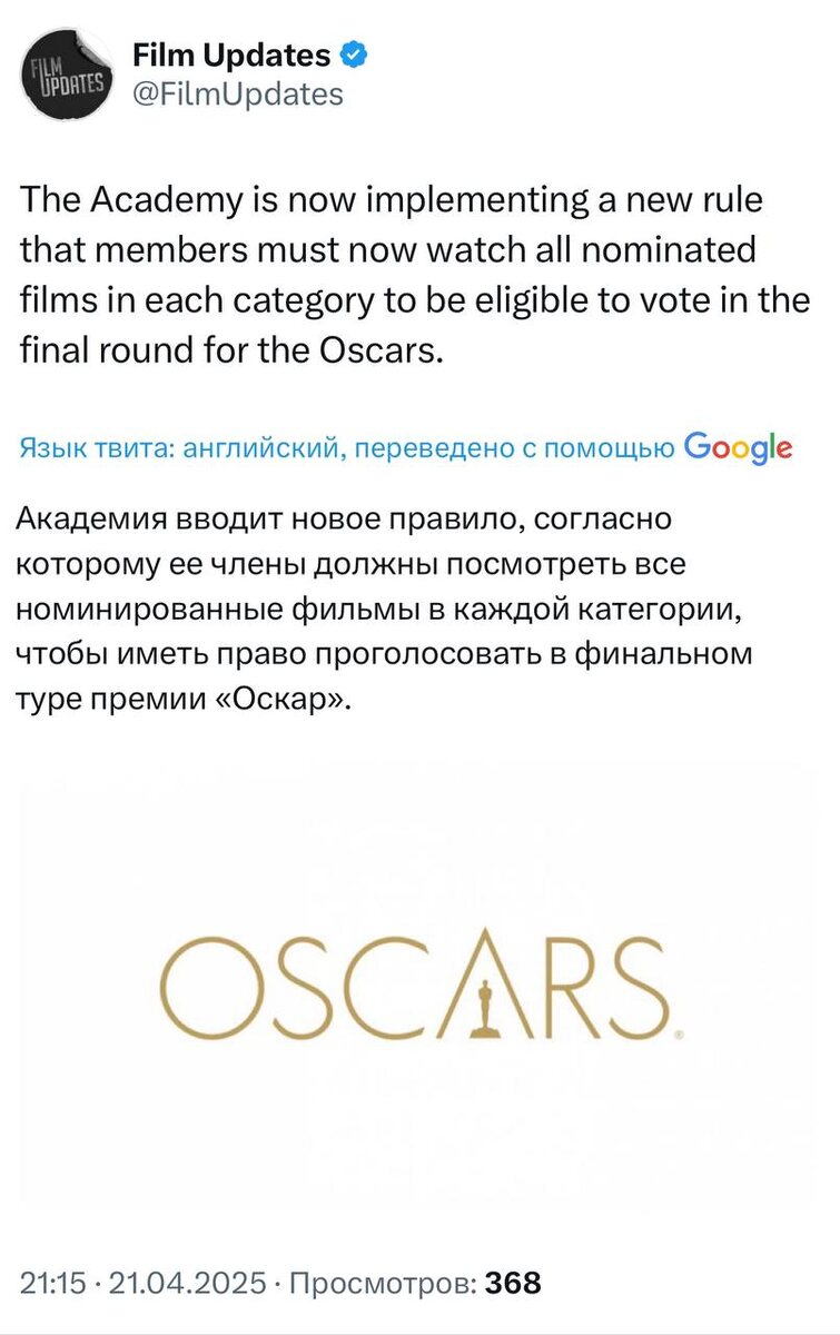 — Ещё было бы неплохо, если бы голосовали по представленному фильму, а не считали, у кого сколько «Оскаров» и есть ли они вообще. Члены академии не будут допущены на церемонии голосования вручения «Оскара», если они не доказали, что посмотрели все номинированные фильмы. "Достаем двойные листочки" после стольких лет? — Всегда. в удивительное время живем, только на 98 премию ввели элементарное правило. 🤭 #новости