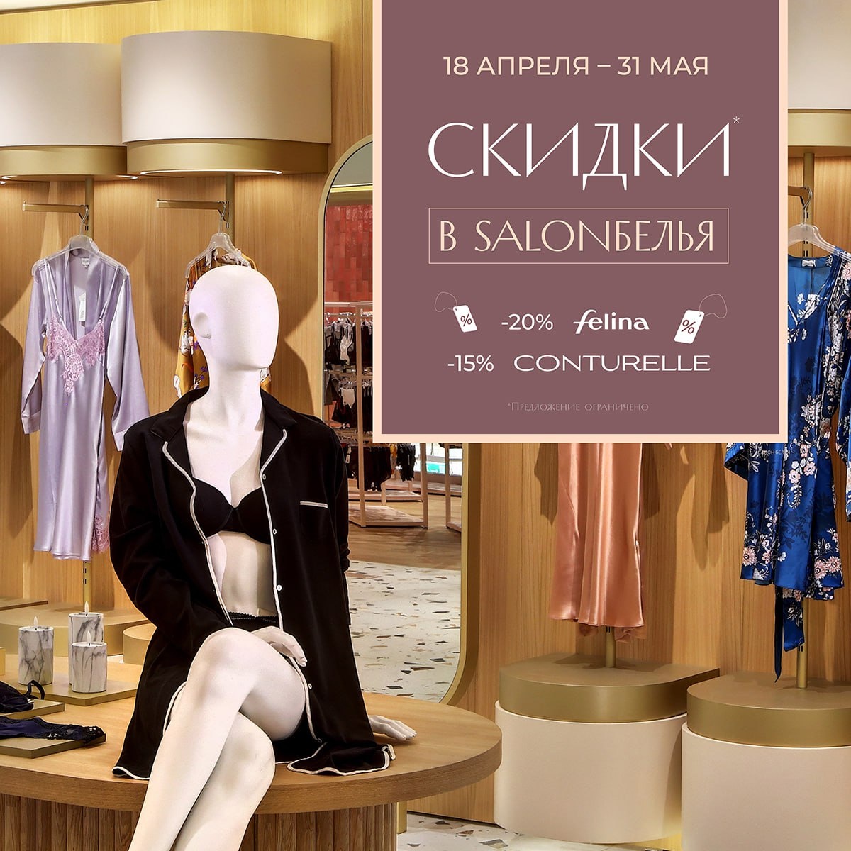 Погрузитесь в мир элегантности и комфорта с изысканным бельём от FELINA и CONTURELLE! В Московском универмаге вы найдете бельё на любой вкус: от изящных кружевных комплектов до практичных и удобных моделей на каждый день – у нас есть всё, чтобы удовлетворить самые взыскательные запросы. Только до 31 мая специальные скидки на модели брендов: FELINA - 20% CONTURELLE - 15% Побалуйте себя роскошью и комфортом! Наша команда профессиональных консультантов всегда готова помочь вам с выбором и подобрать идеальный размер, учитывая все ваши пожелания и особенности фигуры. Мы рады предложить вам широкий выбор моделей, созданных для того, чтобы вы чувствовали себя неотразимой каждый день! Ждём вас в нашем Универмаге! SALONБЕЛЬЯ Московский пр. 205 Б, 2 этаж, вход Рив-Гош Скидка действует только офлайн.