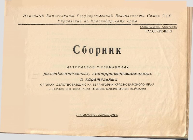 УФСБ России по Краснодарскому краю проводит рассекречивание архивных документальных материалов о деятельности на территории Кубани немецко-фашистских формирований во время Великой Отечественной войны. В рассекреченных материалах содержатся обобщенные сведения о кадровом составе, формах и методах работы карательных органов, а также собранные из разрозненных источников описания злодеяний и зверств немецких солдат.