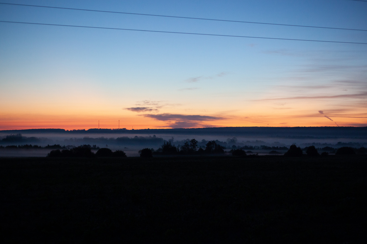 На часах половина третьего ночи. Только что в подмосковном городе Пересвет в нашу машину подсел третий участник поездки, и мы уверенно движемся на север. На небе - ни то закат, ни то рассвет, кто ж его разберёт в середине июня, когда ночь длится от силы пару часов? Но выглядело это так завораживающе, что я остановил машину, мы все из неё вылезли и давай щёлкать затворами. Пейзаж готов!