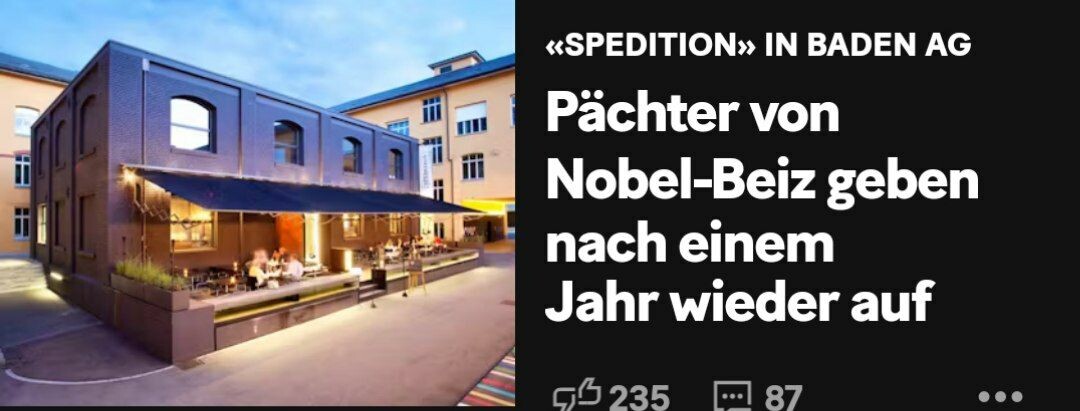 📌 " Ресторан Spedition в Бадене АГ закрылся после всего одного года работы с новыми арендаторами. Причиной называют рост эксплуатационных расходов. Кроме того, значительно снизился объем обеденного бизнеса. Хозяева ресторана работают над поиском новых решений для своих сотрудников. Согласно предоставленной информации, основная проблема заключалась в том, что бизнес в обеденное время потерпел крах : "Многие люди быстро перекусывают в Coop или Migros. А если и приходят, то делят основное блюдо и запивают его водой из-под крана". Владельцы подчеркивают, что цены на самом деле были умеренными: стоимость меню составляла менее 30 франков, включая закуски " #Швейцария