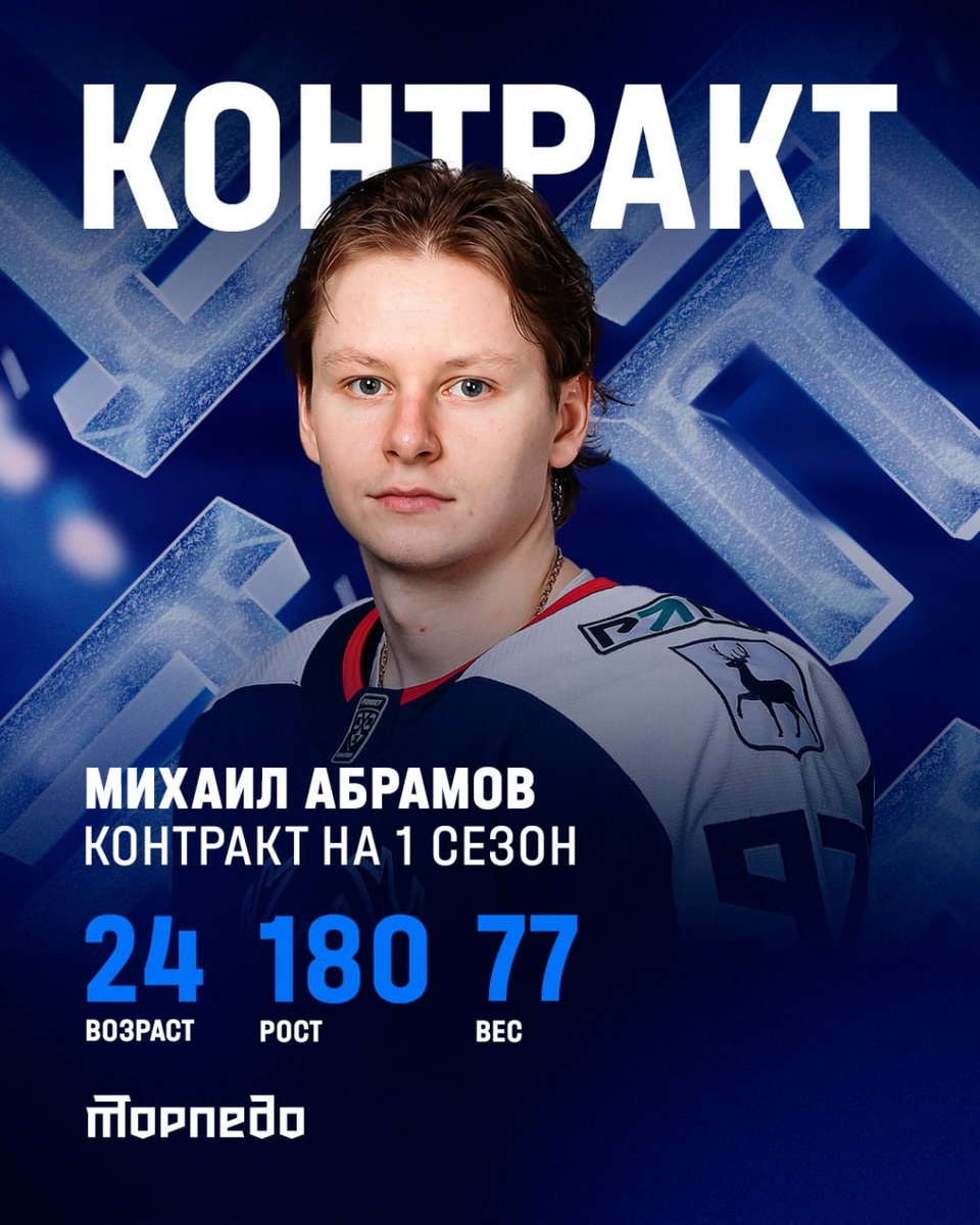 24-летний нападающий 🦌 Михаил Абрамов подписал новый однолетний контракт с хоккейным клубом «Торпедо