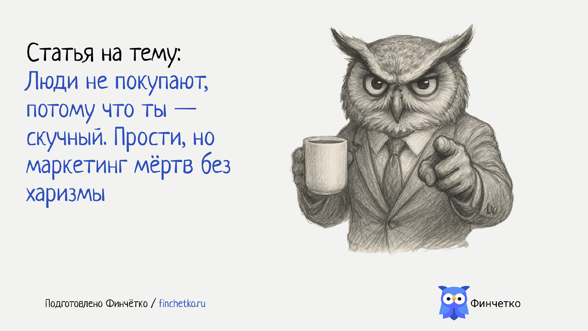 Хватит быть серым. Добавь харизмы: напиши пост, будто это письмо другу, сними рилс, где шутишь над своими факапами, или придумай сову, которая будет пугать клиентов (в хорошем смысле). В 2025 году маркетинг — это не про деньги, а про смелость. Начни сегодня, и завтра клиенты будут не просто покупать — они будут твоими фанатами.