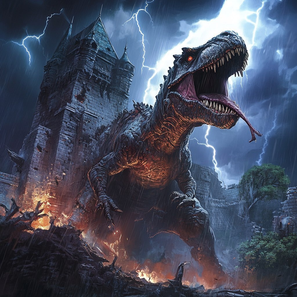 Создано на основе запроса: zombie T-rex raiding a castle. Dramatic, lighting epic rain.