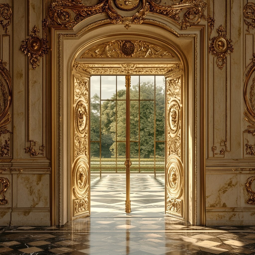Создано на основе запроса: a golden opulent and ornate door swinging open towards the outside