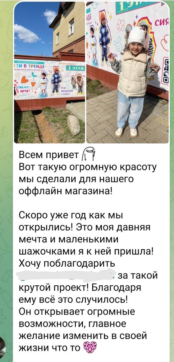 Год назад Руслана открыла свой оффлайн магазин и очень рада тому, что когда то не побоялась прийти в проект и начать исполнять свою мечту. Ведь открытие своего магазина было её мечтой. Хочешь также пиши мне @trunya_u.