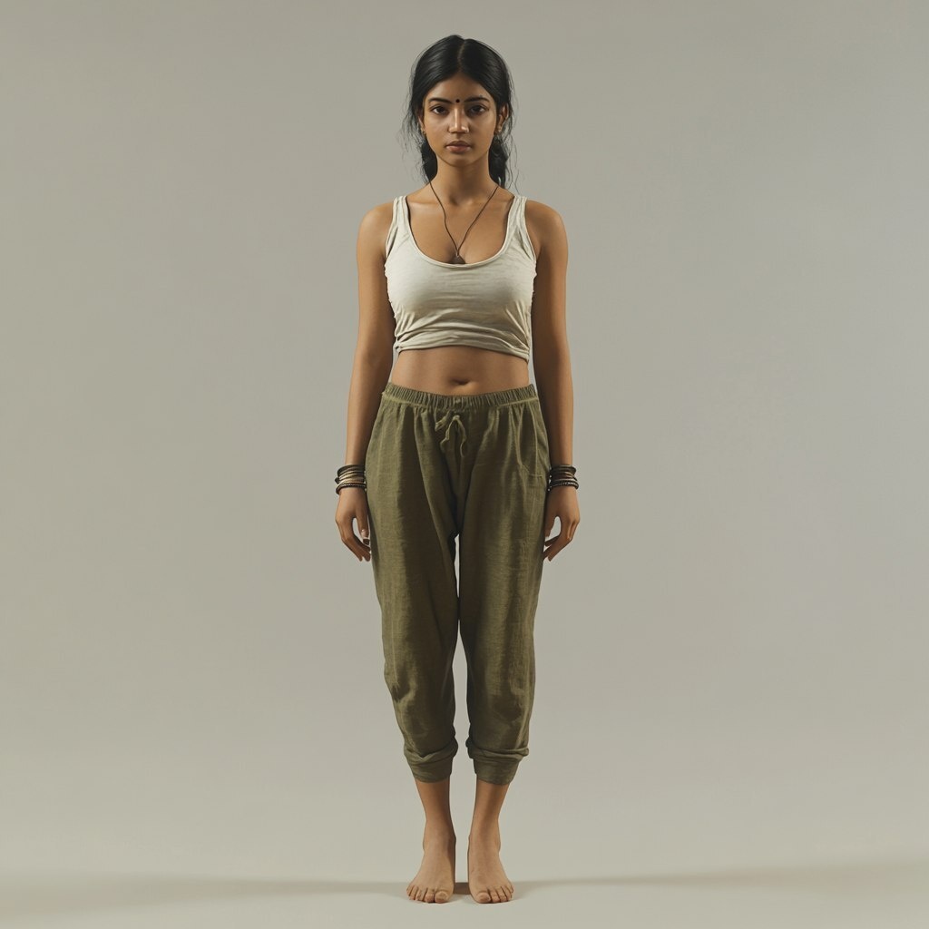 Создано на основе запроса: Realistic full-body image of a young Uttarakhandi female, short and sturdy build, slightly tilted spine, natural