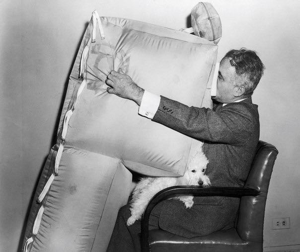 Изобретатель Асен Йорданов демонстрирует подушку безопасности для самолётов, 1957 год