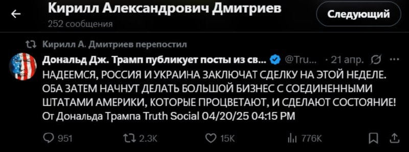 У нашего спецпредставителя Кирилла Дмитриева неоднозначные посылы. В твиттере репост президента США с сообщением о скорой сделке, а в ТК два поста на тему того, что США могут выйти из переговорного процесса. ℹ️ Оптимизма пока не много, визит Уиткоффа в Москву, на этой неделе, будет ключевым, если состоится.