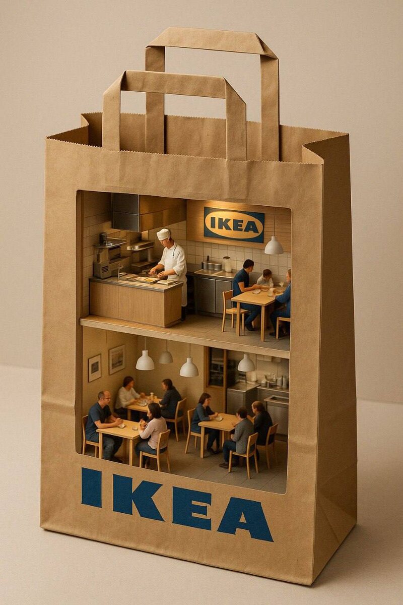 👀Вселенные в брендированных пакетах✈️ Промт для изображения в Sora images: A highly realistic diorama scene inside a brown kraft IKEA paper shopping bag. The bag stands upright on a neutral beige background. Inside the bag, a two-story miniature IKEA cafeteria is built with intricate detail. The upper level shows a chef working in an open kitchen with stainless steel appliances, warm lighting, and an IKEA logo on the wall. Customers are sitting at wooden tables Промт для видео в Kling 1.6: люди в пакете оживают, двигаются, разговаривают друг с другом
