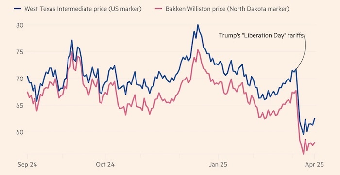 Северная Дакота была пионером сланцевого бума, но теперь борется с падением цен на фоне воинственной торговой риторики Динамика цен на американскую нефть. Источник: The Financial Times Глобальная торговая война, развязанная Дональдом Трампом, угрожает региону, который массово поддержал президента-республиканца на выборах — нефтедобывающей Северной Дакоте. Кроме того, она может перечеркнуть планы президента по увеличению добычи ископаемого топлива в штате, который запустил сланцевую революцию в Америке. Тарифная риторика Трампа спровоцировала распродажу нефти — американские цены упали ниже $60 за баррель (нефть West Texas закрылась на уровне $63,08 за баррель в понедельник). Эскалация напугала весь сланцевый пояс США, один из самых «красных» (республиканских) регионов Америки, усилив страхи надвигающегося замедления. «Это просто страшно», — сказала Трейси Долезал, комиссар округа Данн, одного из ведущих нефтедобывающих районов в бассейне Баккен Северной Дакоты. В прошлом году округ полу